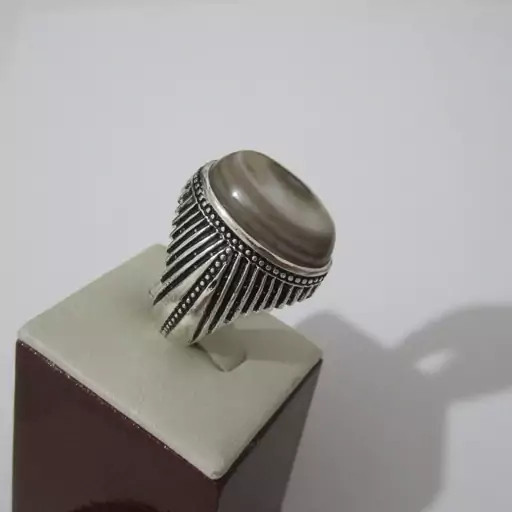 انگشتر مردانه با رکاب برنجی درشت و نگین عقیق سه پوست سفید اصل و معدنی با نقش طبیعی به شکل چشم باباقوری (1003) سایز انگشتر 69 است (قطر داخل حلقه 22.1 میلیمتر است)؛ اندازه نگین 1.8 در 2.5 سانتیمتر است