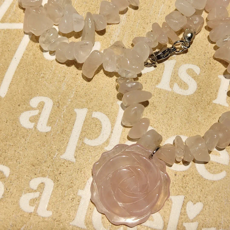 گردنبندسنگ رزکوارتزاصل ومعدنی تراش دست طرح گل ختمی