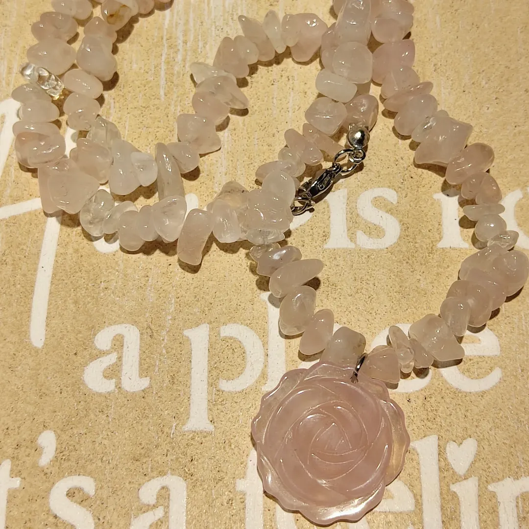 گردنبندسنگ رزکوارتزاصل ومعدنی تراش دست طرح گل ختمی